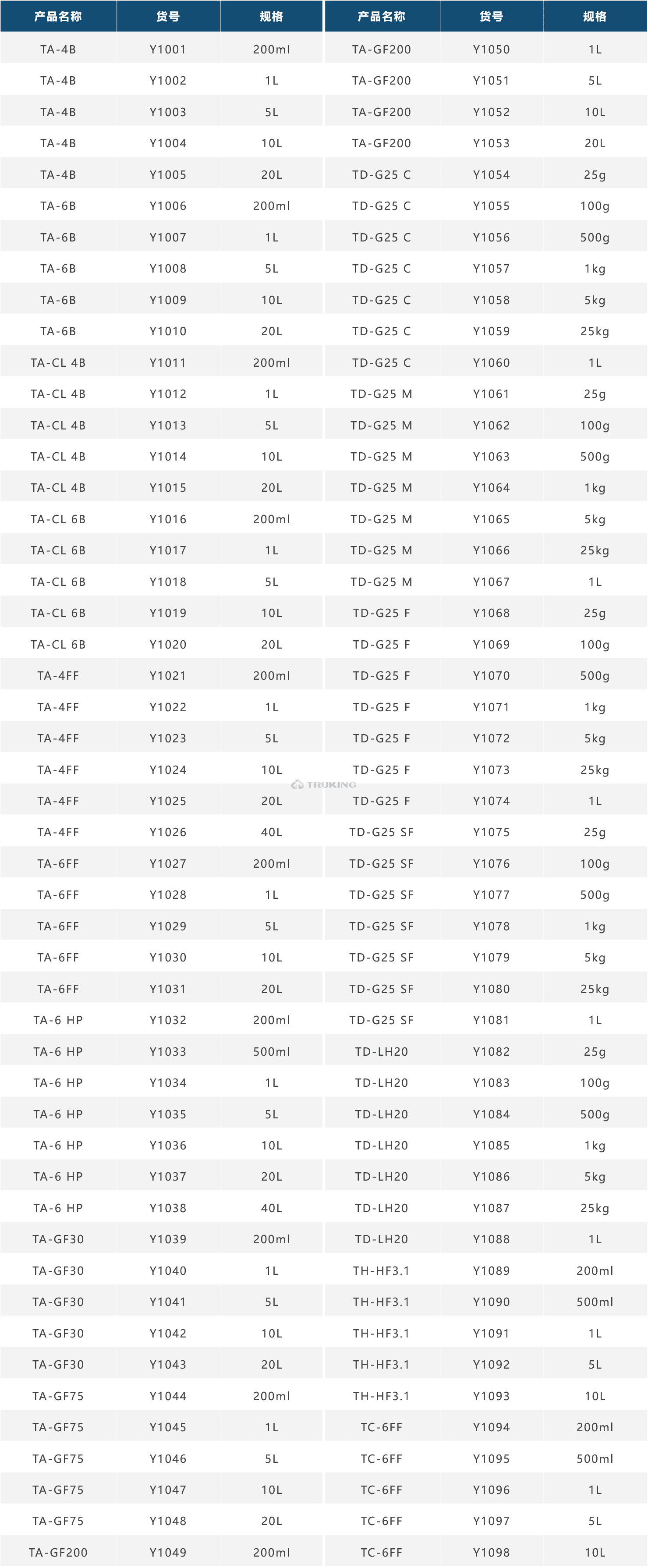 Ø lTA-4FF和TA-6FF分别为4%和6%的琼脂糖经过乳化、漂洗、多次交联、分筛而成的凝胶过滤介质,用于多糖、核酸、病毒等生物大分子的分离纯化或者检测,该介质也经常作为亲和、疏水、离子交换层析的基架。TA-4FF和TA-6FF是在TA-4B和TA-6B的凝胶基础上用双功能试剂交联而成的,交联程度比TA-CL 4B和TA-CL 6B高,物理化学性能更稳定,该类介质可以耐受121℃高压灭菌,流速快,适合在大规模分离纯化中应用。