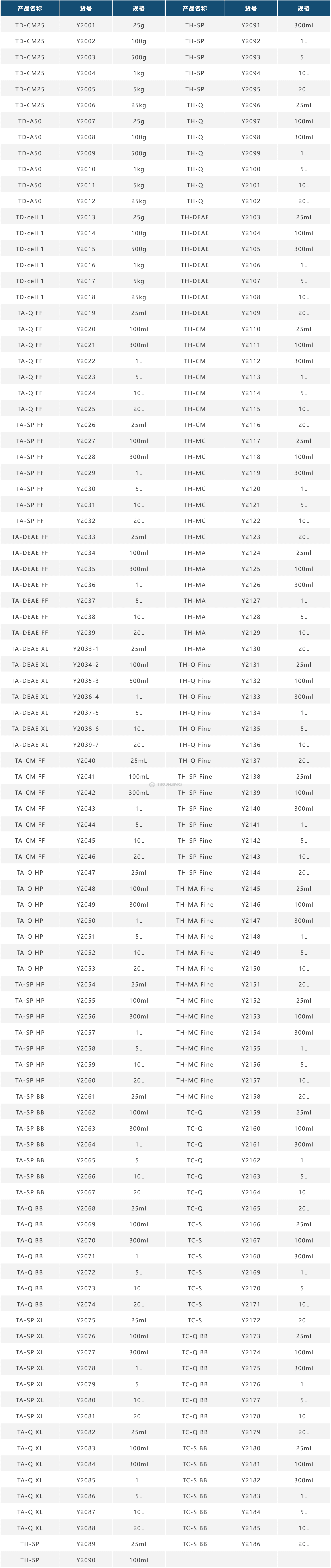 Ø TH(Truking Hard)高刚性琼脂糖基架,可耐受超过5bar的压力。是通过对传统的TA(Truking Agarose) 6FF琼脂糖基架进行化学改构和修饰而成的,具有更好的机械性能。TH(Truking Hard)-IEX是将离子交换基团偶联到带有葡聚糖长链的高刚性琼脂糖上,与TA(Truking Agarose) -IEX FF相比虽有相接近的粒径大小,但具有流速快、反压低、载量高等特点。