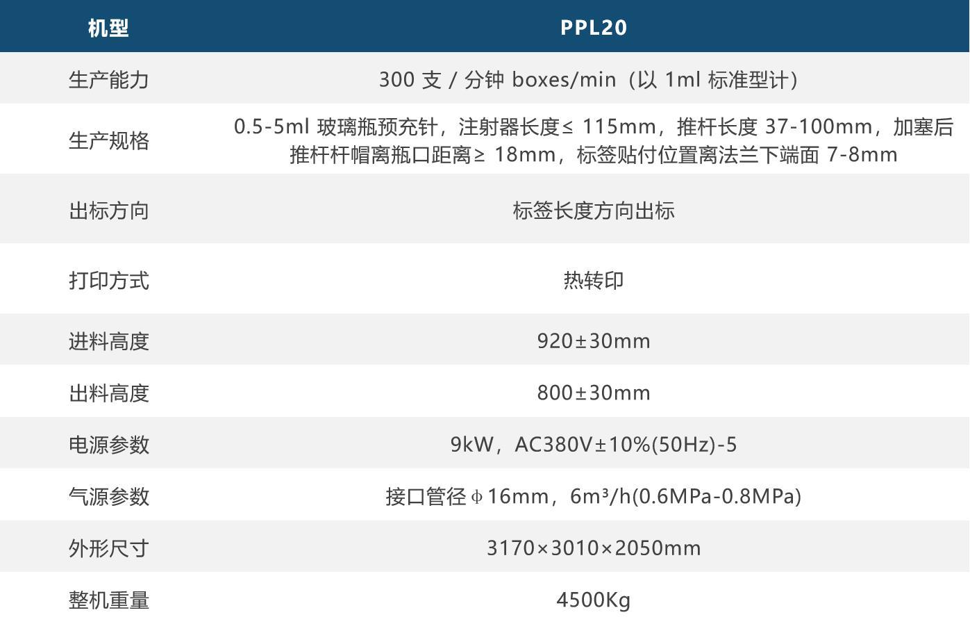 PPL20 是一台全自动高速拧杆贴标一体机,整机设计及制造遵循 GMP、cGMP、GAMP5、CRF21-part11、CE 的规范要求,用于完成预充针产品包装工序的推杆拧入和标签打印粘贴工作,具有自动进料、推杆理料送料、推杆拧入胶塞、标签打印粘贴、不良品剔除、合格品输出等功能。