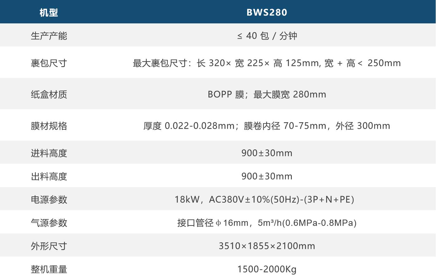 BWS280 裹包机是一款全自动三维裹包机,整机设计及制造遵循 GMP、cGMP、GAMP5、CRF21-part11、CE 的规范要求,主要用于西林瓶、预充针、安瓿瓶、卡式瓶、BFS 等产品的小盒三维裹包包装,具有自动进料输送、小盒立盒整理、膜材切割输送、消除静电、裹盒端封、折耳侧封、气流散热等功能;具有进料检测、膜材料位、输送、到位检测、热封温度检测等生产全过程监测系统。