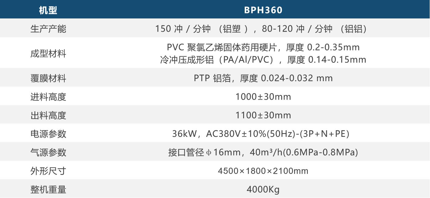 BPH360 是一台高速泡罩包装机,整机设计及制造遵循 GMP、cGMP、GAMP5、CRF21-part11、CE 的规范要求,主要用于胶囊、片剂等口服固体制剂的自动化泡罩包装,具有自动泡罩成型、自动加料、覆膜热封、三期压印、冲易撕线、板块冲裁、废边收集、转接输出等功能,配有泡罩成型检测、泡罩加料检测等完善的质量保证功能。