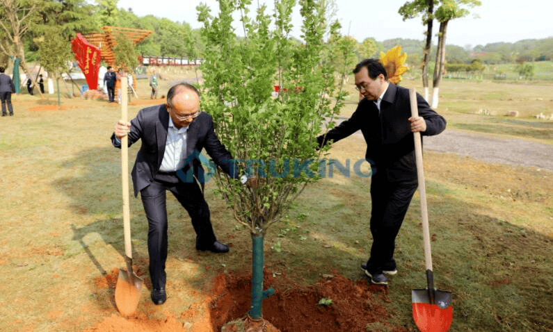 在宁乡企业文化公园星空体育登录官网入口,星空全站APP下载区,宁乡市委书记周辉、星空体育登录官网入口,星空全站APP下载科技董事长唐岳将树苗抬到树坑中,然后与学生们一起种树