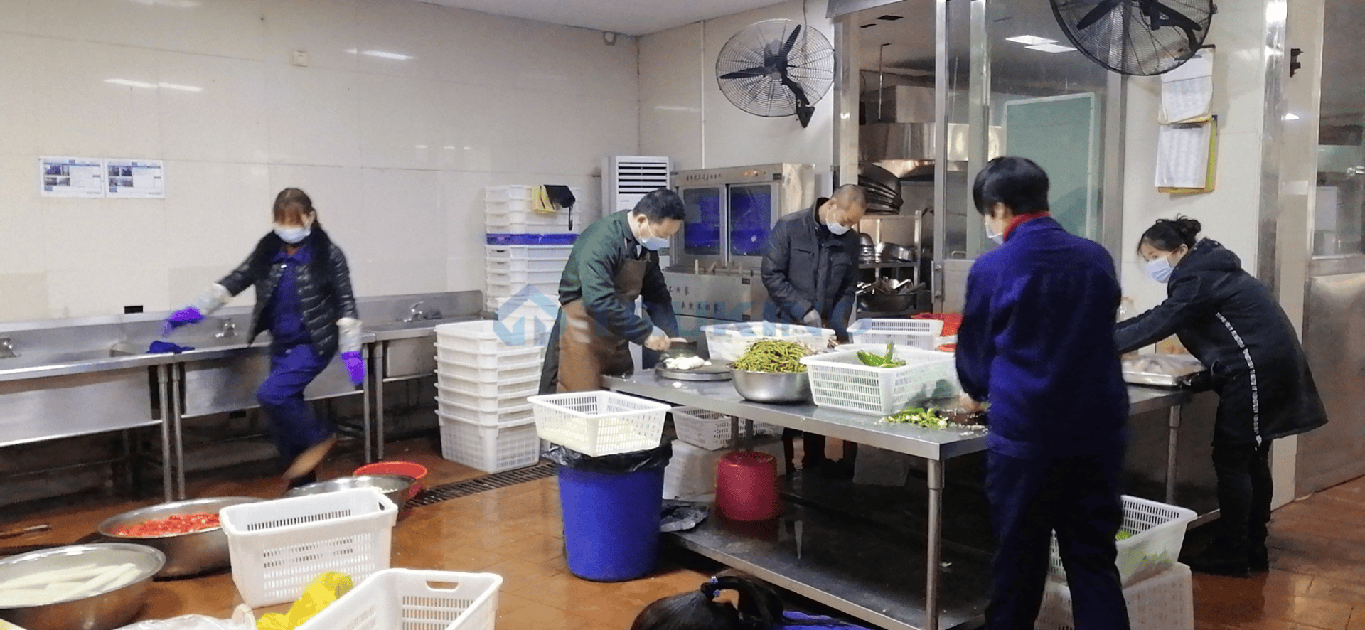▲后勤保障部副部长彭灿(左二)和同事一起为复工员工准备饭菜