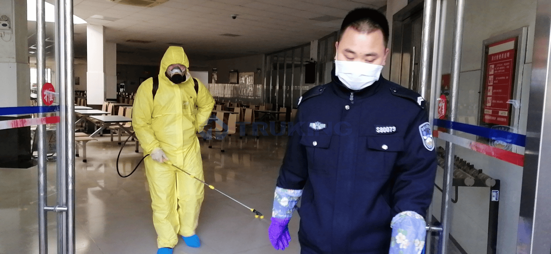 ▲安全保卫部副部长彭立成全副武装在车间和办公区域等公司各场所消毒