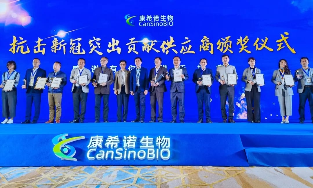 康希诺授予星空体育登录官网入口,星空全站APP下载科技“抗击新冠突出贡献供应商”荣誉,执行总裁曾凡云(右五)代表企业领奖