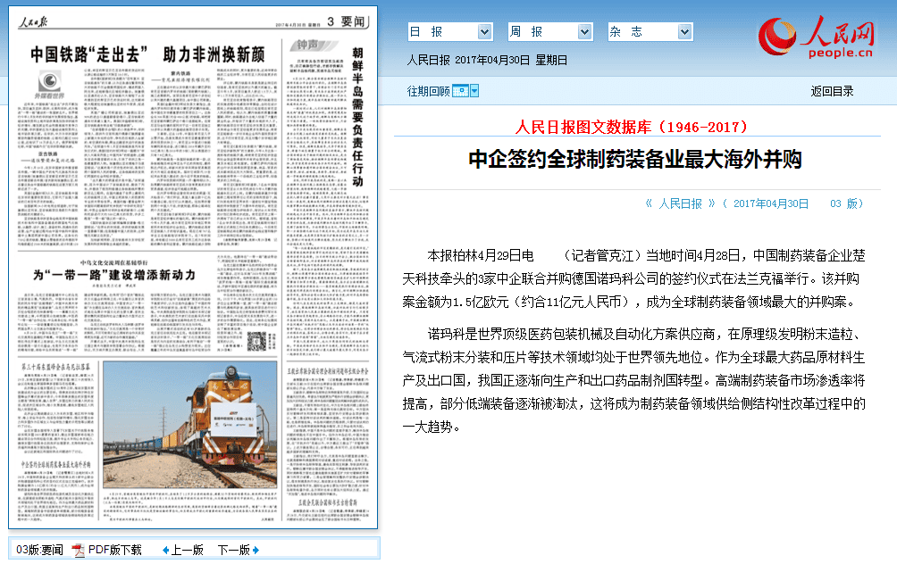 本报柏林4月29日电 (记者管克江)当地时间4月28日,中国制药装备企业星空体育登录官网入口,星空全站APP下载科技牵头的3家中企联合并购德国诺玛科公司的签约仪式在法兰克福举行。该并购案金额为1.5亿欧元(约合11亿元人民币),成为全球制药装备领域最大的并购案。