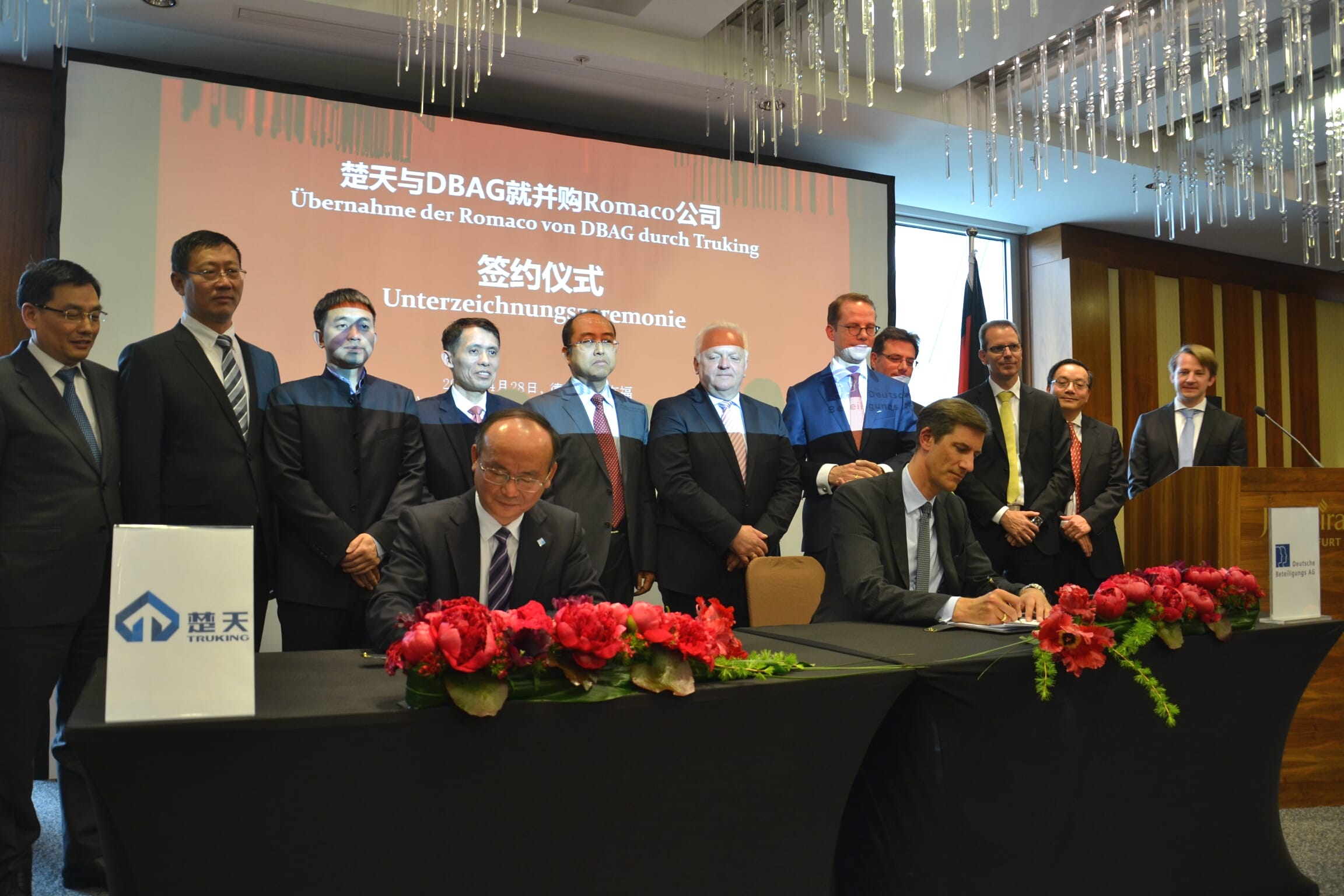 图说:星空体育登录官网入口,星空全站APP下载投资董事长、星空体育登录官网入口,星空全站APP下载科技董事长兼总裁唐岳(前排左)和DBAG董事Rolf Scheffels博士(前排右)签署了并购协议。