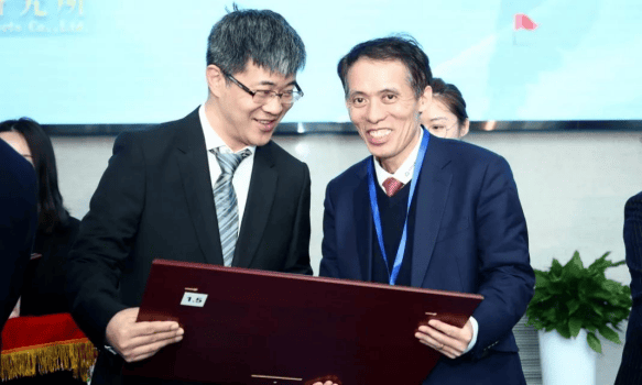 Вице-президент CNBG Ян Хуэйчуань вручает награду генеральному директору TRUCKING Цзэн Фаньюню за выдающийся вклад в командную работу.