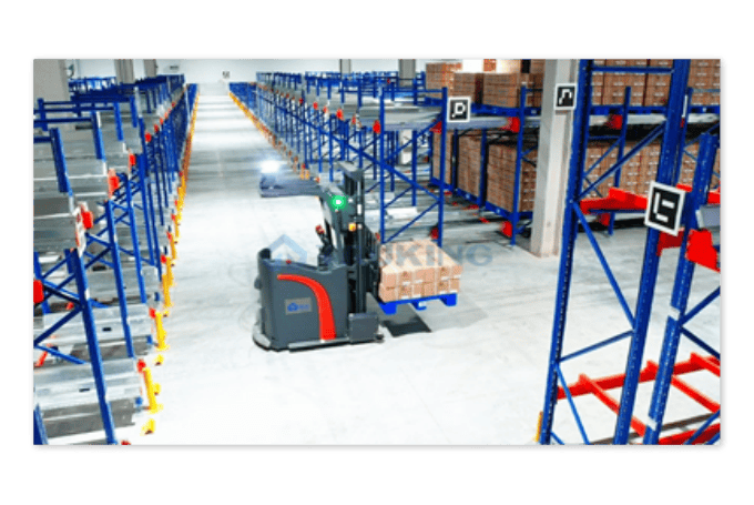 Система использует автоматические транспортные тележки и другие устройства для оптимизации пространства склада. Эффективное автоматизированное решение для крупногабаритных складских помещений.